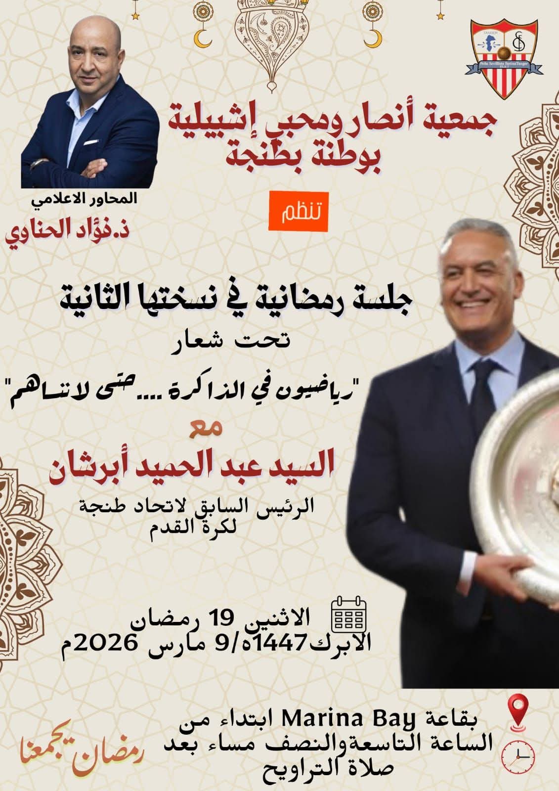 تستضيف جمعية أنصار ومحبي إشبيلية بوطينة بمدينة طنجة، في إطار برنامجها الثقافي الرمضاني، السيد عبد الحميد أبرشان، الرئيس السابق لنادي اتحاد طنجة لكرة القدم، في جلسة رمضانية في نسختها الثانية تحت شعار “ياضيوف في الذاكرة… حتى لا ننسى”.