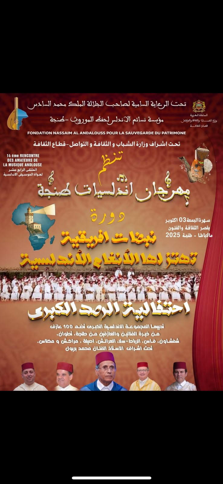 تشهد مدينة طنجة يوم الجمعة 3 أكتوبر 2025، انطلاق فعاليات الدورة الرابعة عشرة لمهرجان أنغام الأندلسيات، الذي تنظمه مؤسسة نسائم الأندلس لحفظ الموروث، بتنسيق مع وزارة الشباب والثقافة والتواصل – قطاع الثقافة.