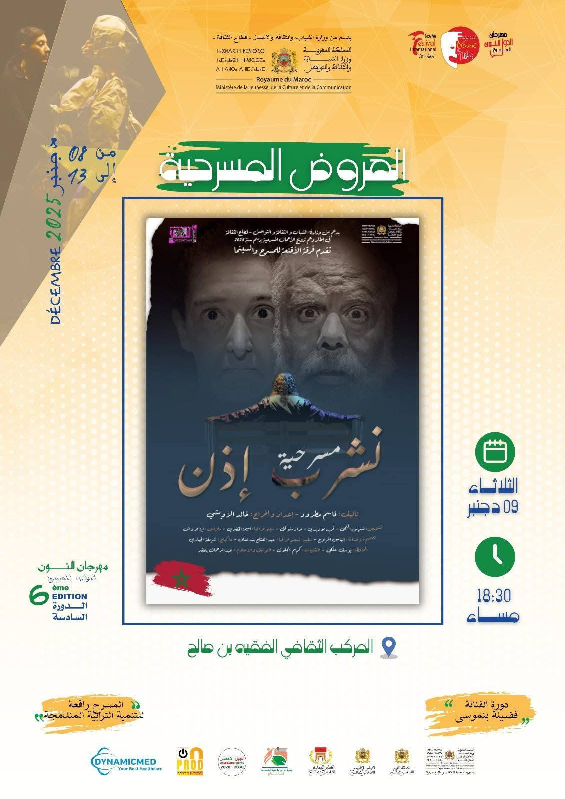 برمجت فعاليات الدورة السادسة من مهرجان النون الدولي للمسرح بمدينة الفقيه بن صالح، الذي تنظمه فرقة مسرح النون والفنون من 08 إلى 13 دجنبر 2025، تحت شعار «المسرح رافعة للتنمية الترابية المندمجة»، ستة عروض مسرحية وطنية ودولية متنوعة.